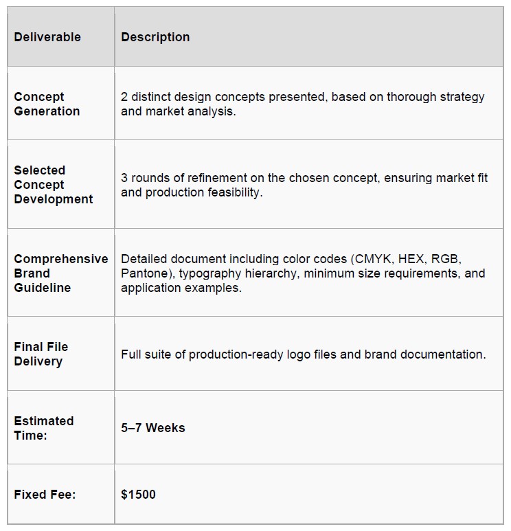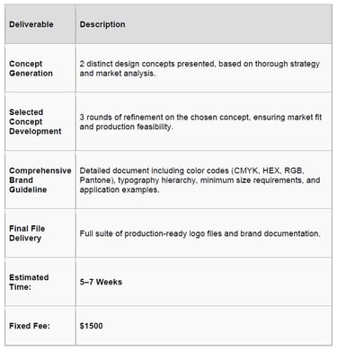 This package is ideal for clients who have an existing logo that requires professional polishing, optimization for print, and foundational brand rules.