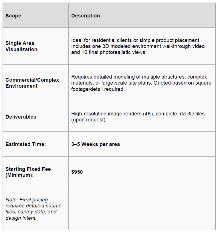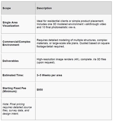 Utilizing industry-standard software, we create photorealistic 3D renderings for architectural visualization, product mockups, or residential/commercial land planning.
