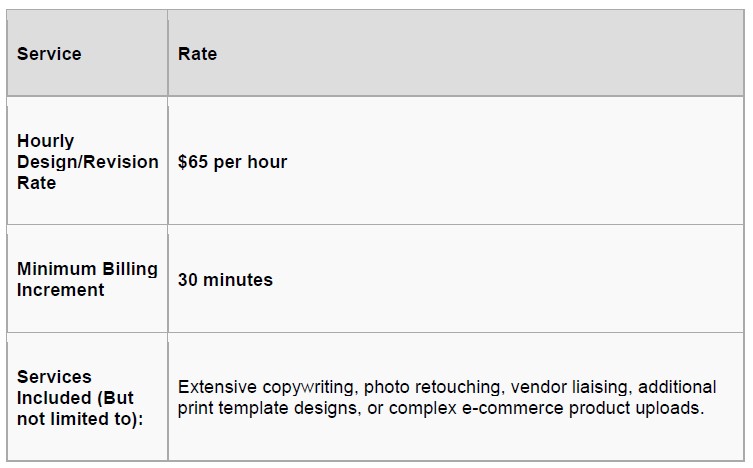 For tasks that fall outside the defined scope of our fixed-price packages—including rush jobs, complex revisions beyond agreed rounds, or specialized tasks—work is billed on an hourly basis.